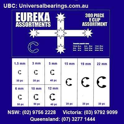 Circlip E Type Metric Carbon Steel Kit 300 Piece. The Eureka Assortments container is made of heavy durable plastic, each holding individual slots separating each product size independently. E-Clips, made of carbon steel with a black phosphate finish, retain positive retention of pulleys, sprockets, springs, & bearings on shafts, & rods. 300 piece set sorted in a labeled polypropylene box for convenient reference. Refills available.